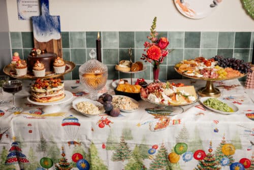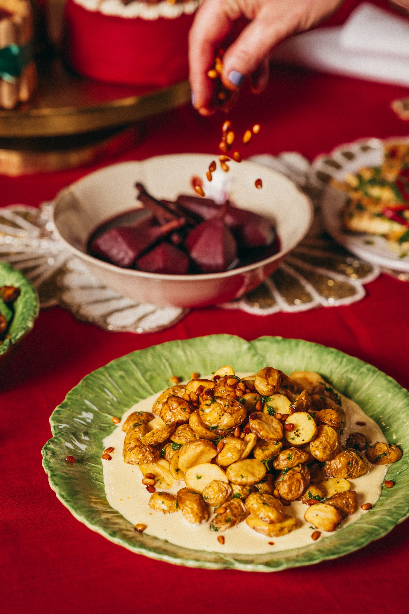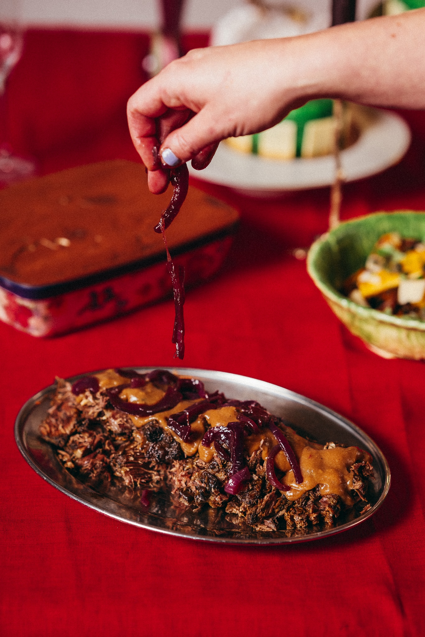 Pastinaaksoep, Krokant buikspek met pruimensaus Langzaam gegaarde rundersbrisket met laurierjus Gratin van kruidige kool en aardappels met gruyère en ricotta Flespompoensalade met sinaasappel en gekarameliseerde honing Spruitjessalade met parmezaan en citroendressing Krokante aardappelen met aioli Huisgemaakte tiramisu 30 p.p. (aanpassingen en dieetwensen mogelijk)