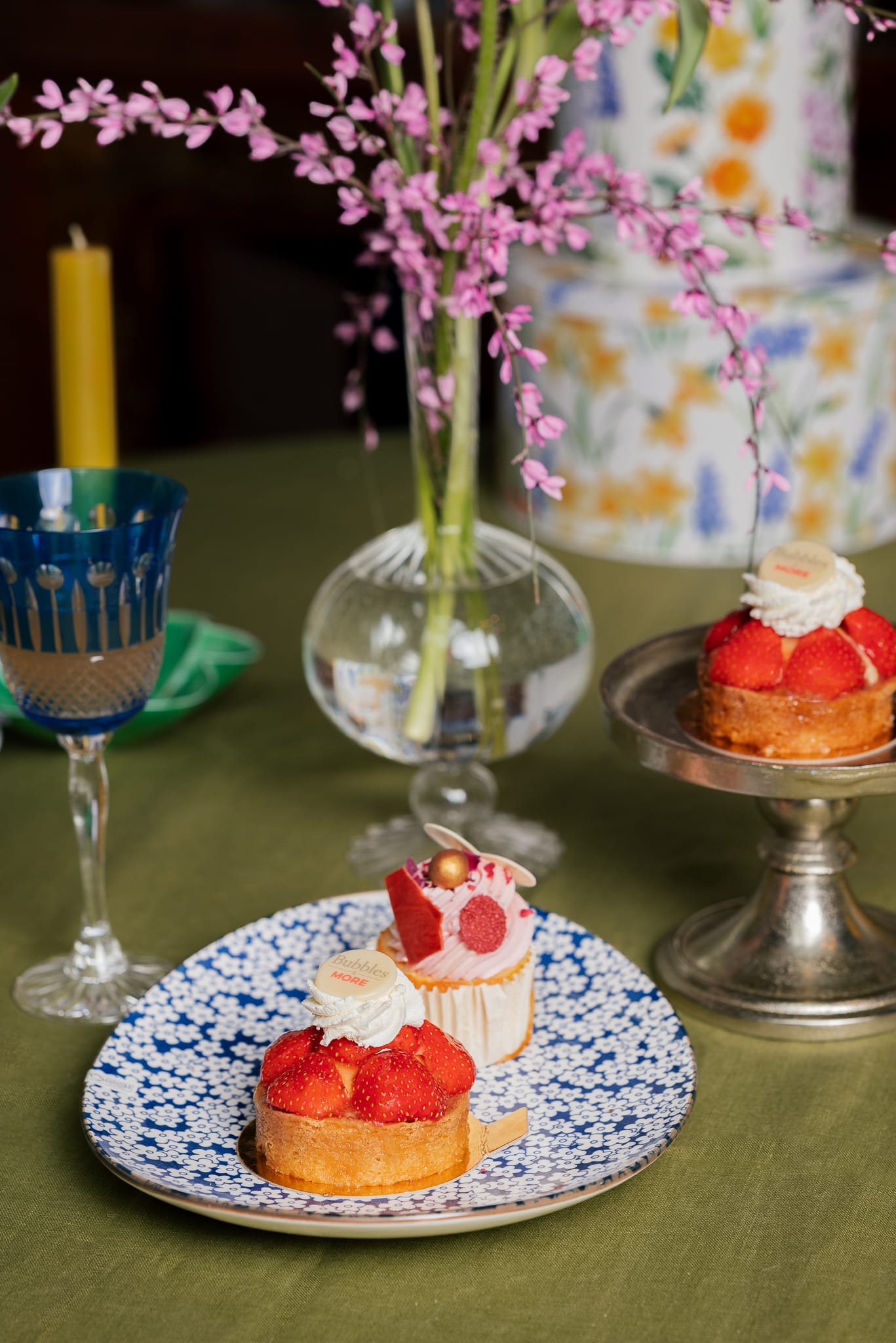 Gebakje met sloffenbodem, verse aardbeien en slagoom