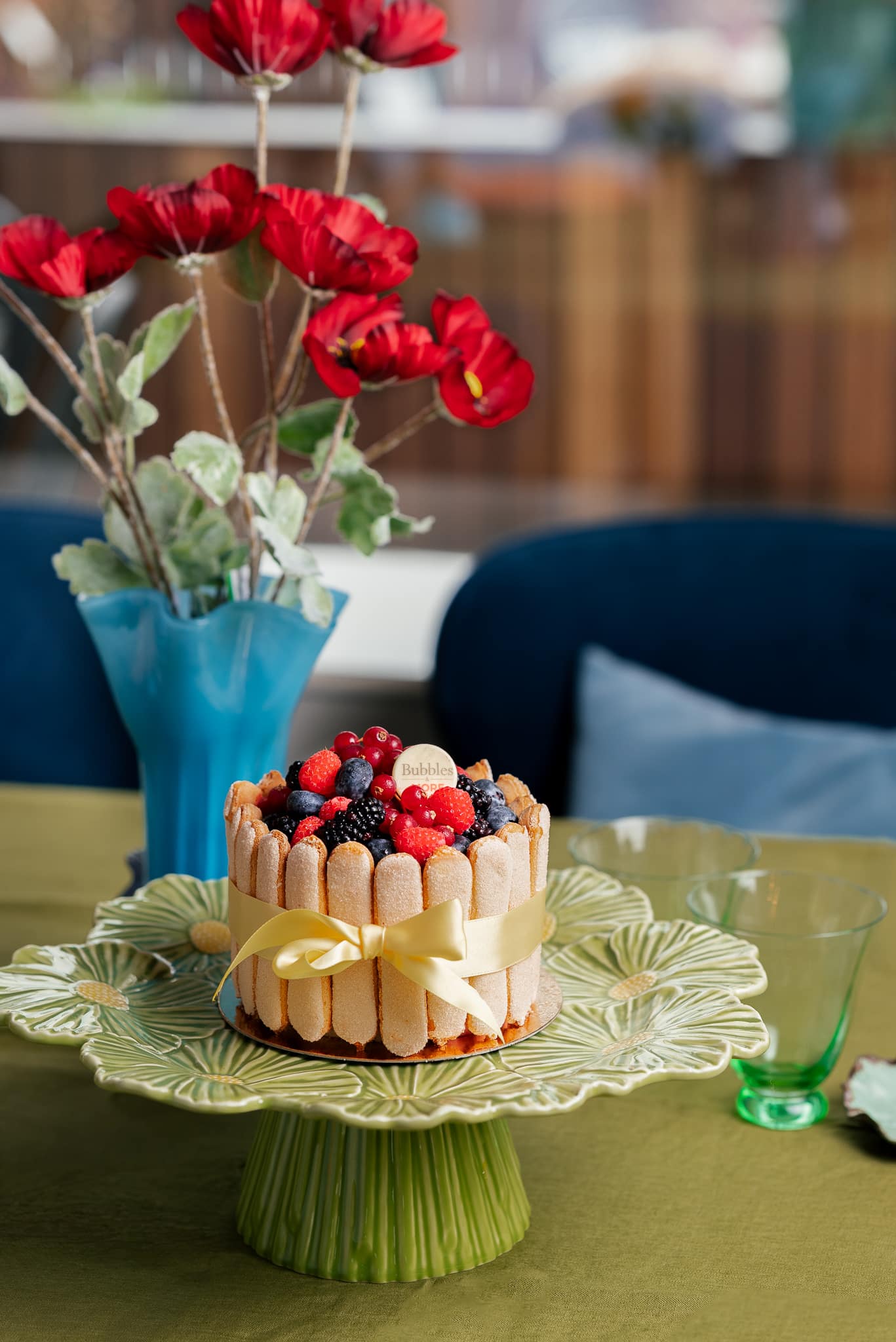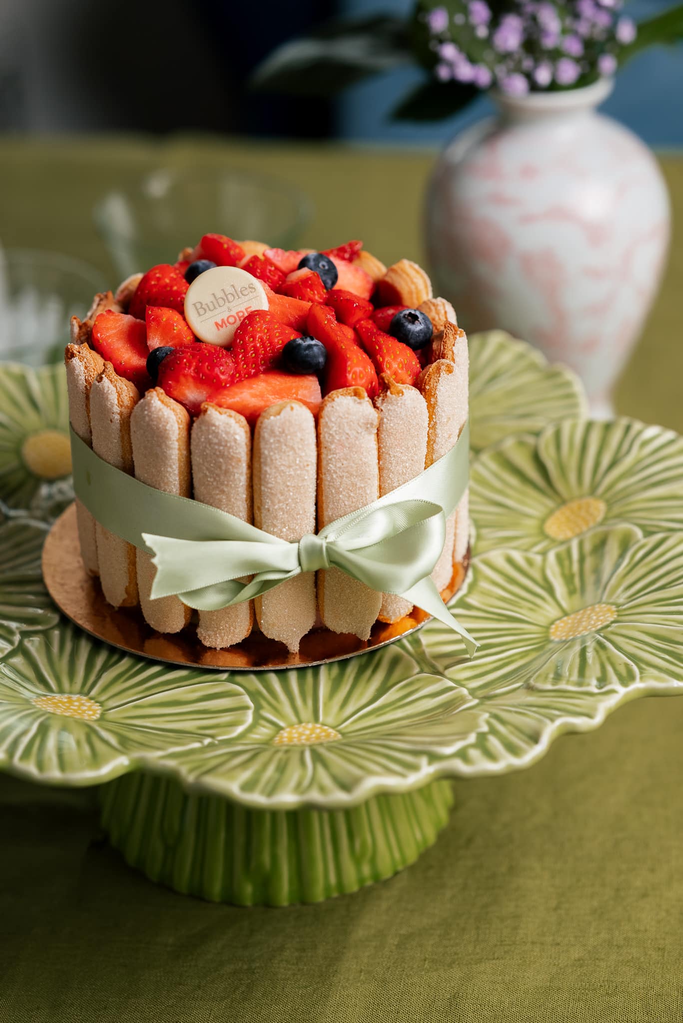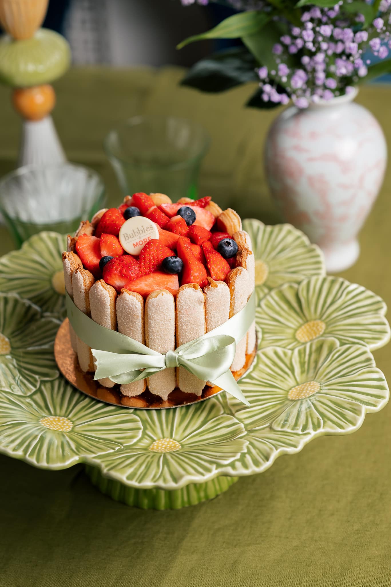 De Charlotte Taart bestaat uit een cake, gevuld met een laag frambozenbavarois en is aan de buitenkant afgewerkt met lange vingers.