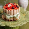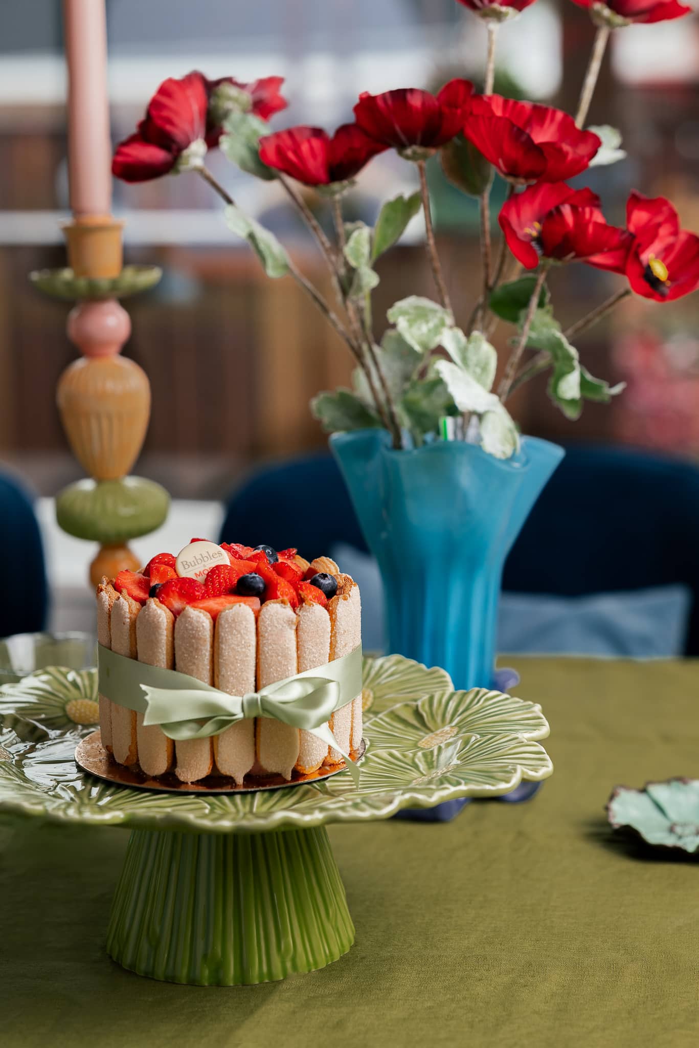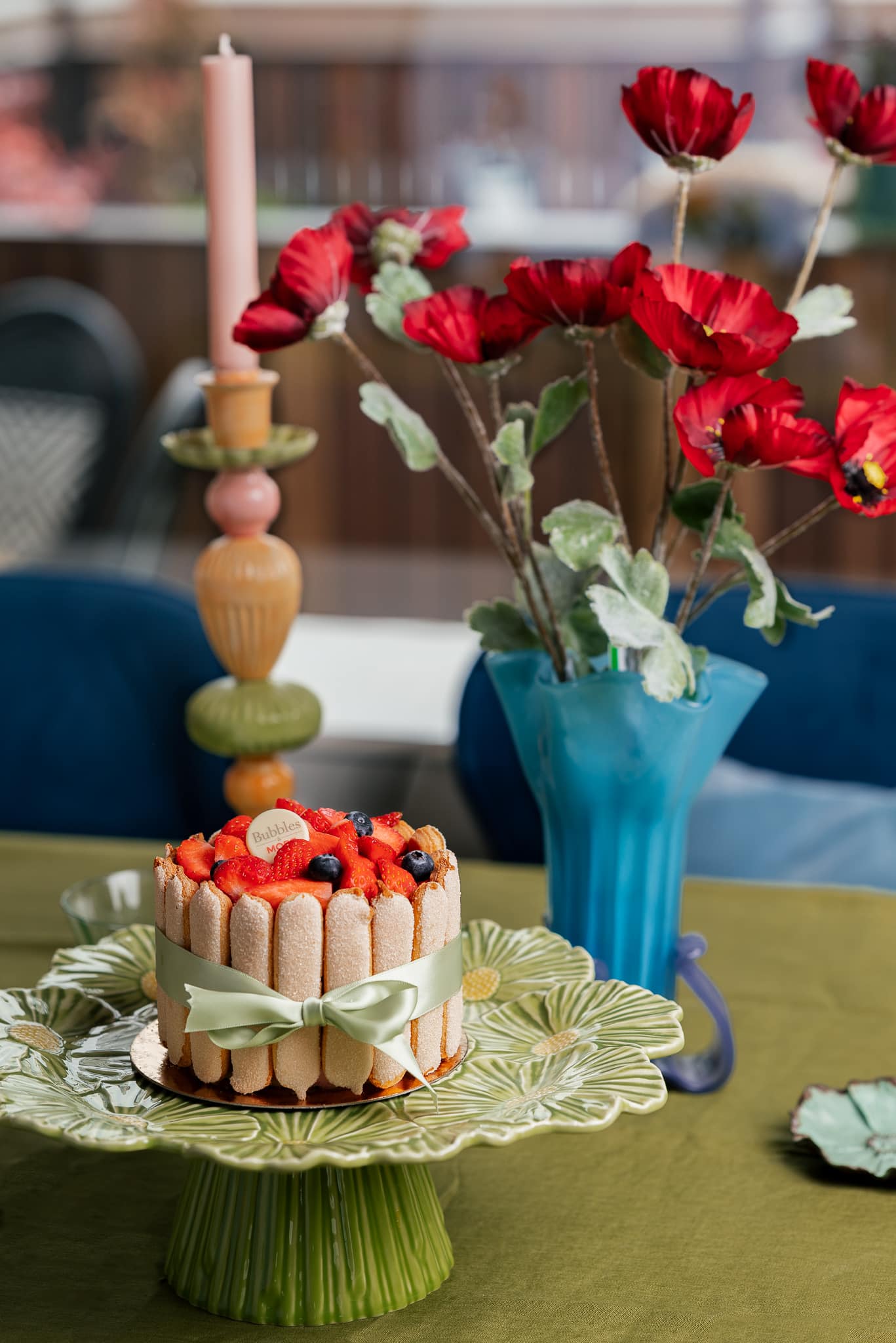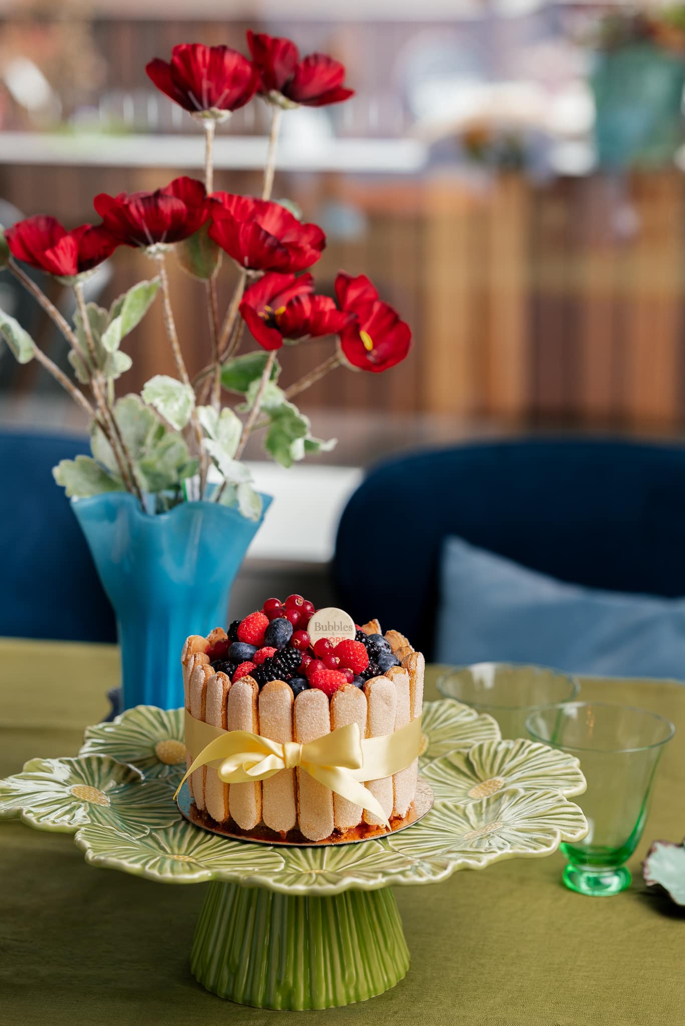 De Charlotte Taart bestaat uit een cake, gevuld met een laag frambozenbavarois en is aan de buitenkant afgewerkt met lange vingers.