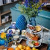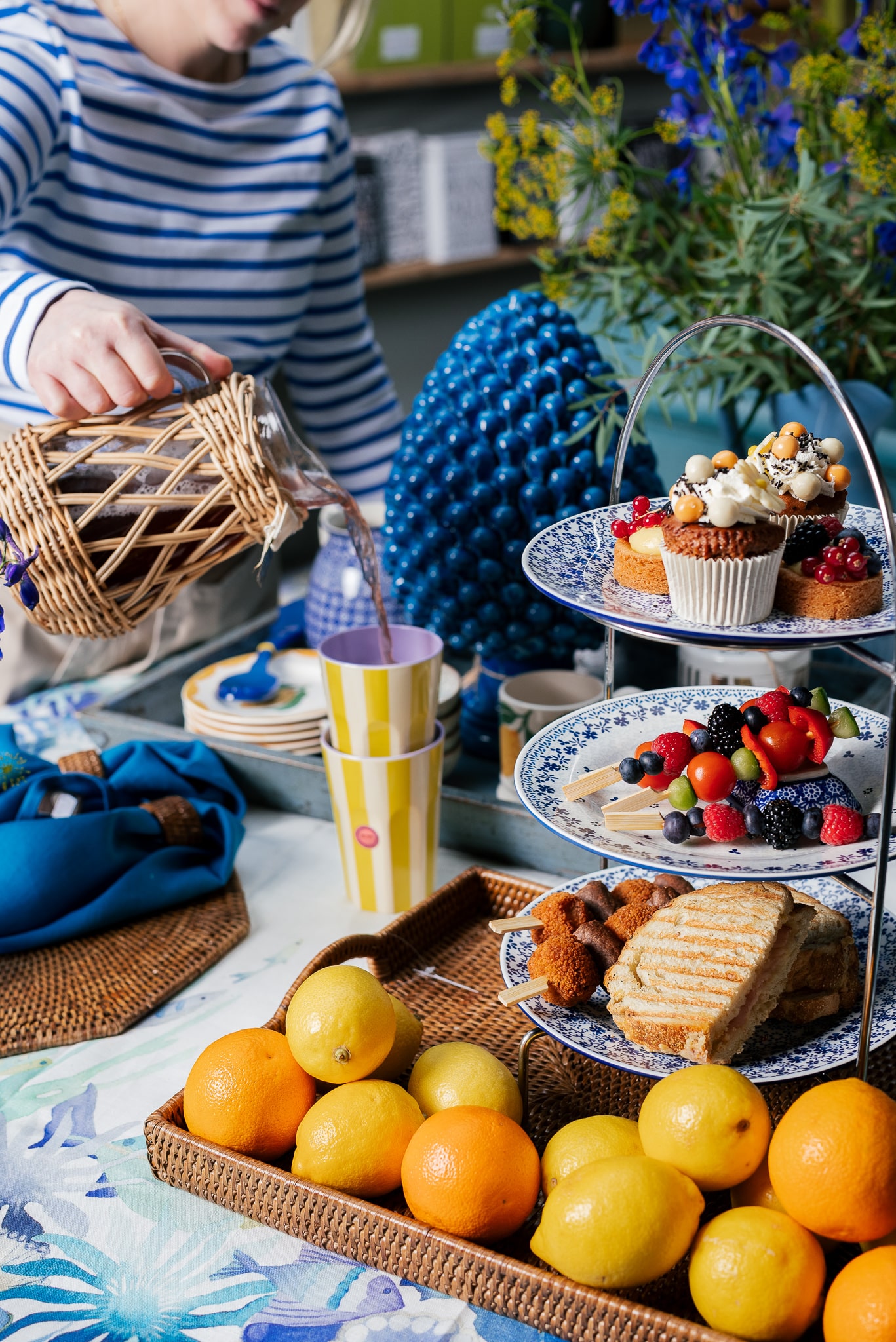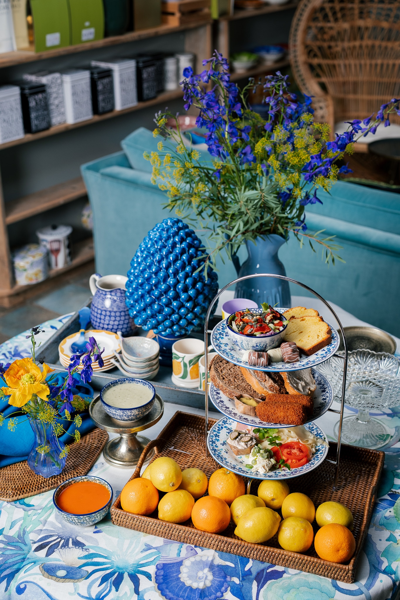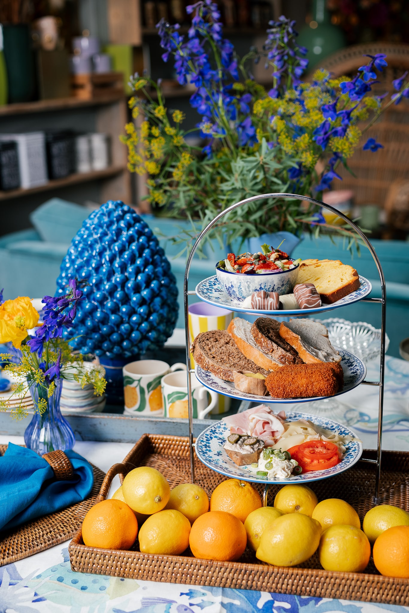 Kleintje soep, brood, boter, huisgemaakte jam, kleine salade, drie soorten beleg, kroket of quiche en huisgemaakte zoete lekkernijen.